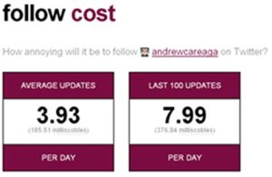 So there’s a new “measurement” tool for Twitter users that gauges the annoyance factor of the “tweeps” (twitter peeps) you follow. It’s called follow cost, and it calculates your average number of Twitter updates (tweets) per day as well as the average number of daily updates for your last 100 posts to determine your short-term tweet trend. Those figures are then converted into milliscobles. According to (jeff)isageek.net, one milliscoble “is defined as 1/1000th of the average daily Twitter status updates by Robert Scoble,” who happens to be a very prolific tweeter.
