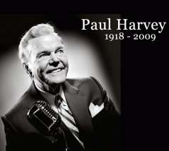 When I first learned (via Twitter) that Paul Harvey died Saturday (Feb. 23, 2009) at age 90, my thoughts traveled back in time some 35 years, to the early 1970s, when I would listen to his newscasts over breakfast in my grandmother’s kitchen. Paul Harvey came on either just before or just Earl Nightingale. I can’t remember which aired first. But over breakfast, I would listen to them both: Nightingale, the forerunner for today’s motivational speakers, and Harvey, the plainspoken Midwesterner whose folksy, staccato delivery of news item after news item — page 3 after page 2 after page 1 — brought the day’s happenings into focus. It was a deadpan delivery, void of any hype, drama or sensationalism. The only emotion Harvey’s voiced evoked was a kind of self-effacing humor, an occasional wry chuckle to accentuate a particularly ironic or weird man-bites-dog twist to a news story.