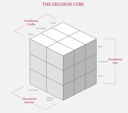 Jon McGee’s “decision cube,” a contextual tool for adapting to the disruptive forces buffeting higher education. (Image courtesy of The Lawlor Group, http://www.thelawlorgroup.com.)