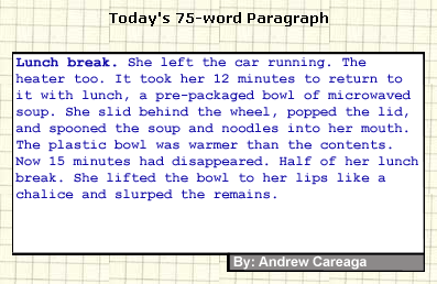 I combined the two ideas, left out a lot of the back story about the woman that I had developed in my head (she was slurping down microwaved soup because she’d forgotten to bring her salad to work, left it on the counter because she was too busy feeding the dogs, and she had hoped to take her dirty car to the car wash over lunch break, and more stuff like that), and stripped it down to the 75 words.